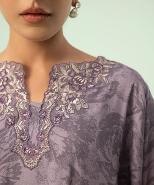 Opt for pastel hues this season with our dull lilac linen three-piece featuring artistic florals.